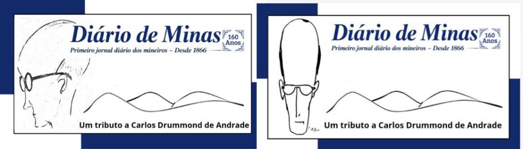 Foi exatamente essa faceta de desenhista do autor do “Poema de Sete Faces” que nos inspirou na construção da identidade visual dessa coluna no Diário de Minas. Escolhidas as autocaricaturas que deveriam compor a arte, acrescentamos aos traços drummondianos algumas curvas alusivas às montanhas mineiras, por entre as quais nasceu o poeta. Uma lúdica associação do escritor com a mineiridade. Afinal, mesmo vivendo grande parte de sua vida na metrópole (Rio de Janeiro), o “ilustre itabirano” jamais tentou apagar suas raízes interioranas, conseguindo mergulhar fundo – com um aguçado olhar para as coisas simples e singelas do cotidiano – no que há de mais universal na alma humana.