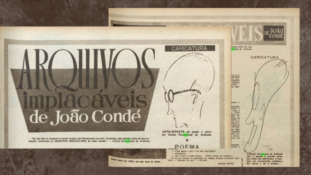 O itabirano que, àquela altura da carreira, dispensava apresentações, era apresentado pela revista como “o grande poeta” que reunia mais um predicado: as qualidades de “caricaturista autêntico, dos outros e de si próprio”. Já bastante conhecido e consagrado pela crítica e pelos leitores, não surpreende que Drummond fosse um dos principais objetos de interesse de João Condé, a quem assim se referia: “Se um dia eu rasgasse os meus versos, por desencanto ou nojo da poesia, não estaria certo de sua extinção: restariam os arquivos implacáveis de João Condé”.