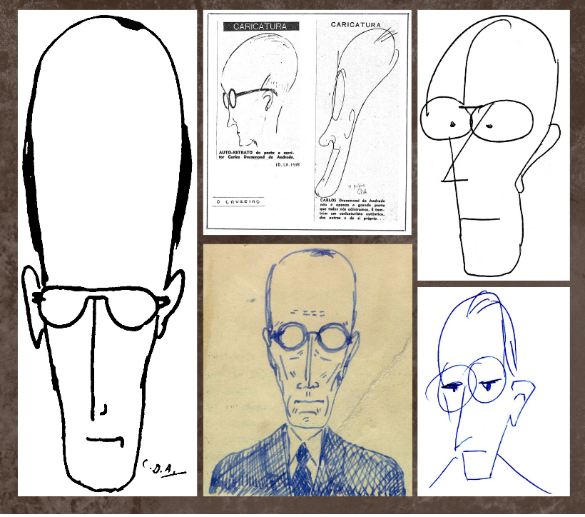 Além dessas duas autocaricaturas publicadas em “O Cruzeiro”, tivemos acesso a outras versões – todas elas gentilmente cedidas por seu neto, o artista plástico e produtor cultural Pedro Drummond. Como se vê, não somente os versos e as crônicas drummondianas nos deixam entrever a presença da concepção estética modernista. Seus desenhos também nos remetem a um estilo que foge de qualquer rebuscamento da forma. Eles se valem, ao contrário, de traços minimalistas e ligeiros, que captam a essência dos elementos caracterizadores de sua fisionomia.