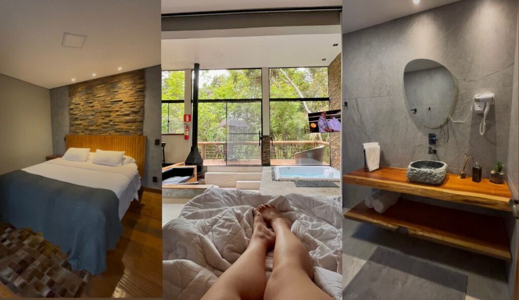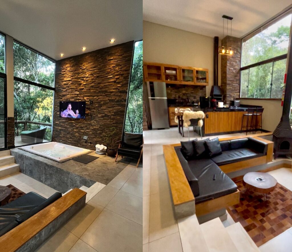 O ambiente impressiona logo na chegada: paredes de vidro revelam o verde intenso da floresta, enquanto o interior combina madeira, pedra e iluminação suave, criando uma atmosfera acolhedora e elegante. A sala rebaixada com lareira e o spa com hidromassagem voltado para a natureza transformam o espaço em um convite irresistível ao relaxamento.