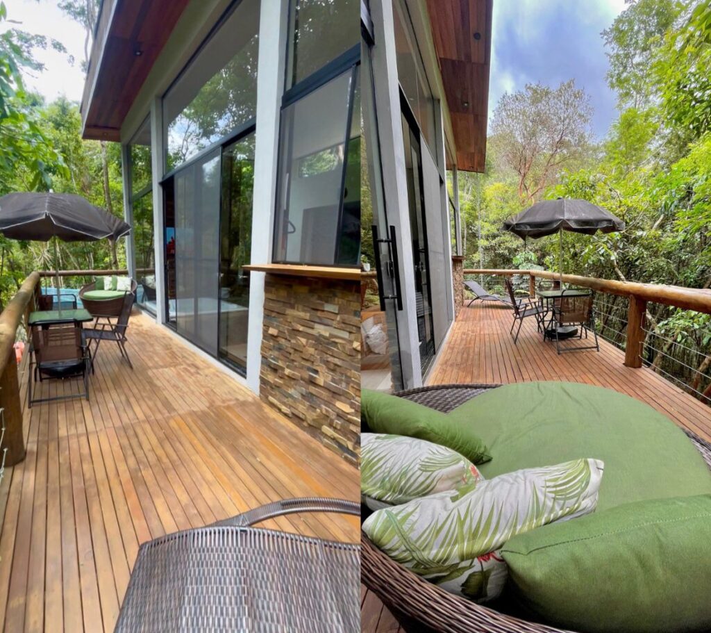 Do lado de fora, o deck de madeira cercado pela mata é um dos pontos altos da hospedagem. Ali, entre espreguiçadeiras ao ar livre, é possível relaxar, ler um bom livro ou apreciar o entardecer em meio à tranquilidade do cenário natural.
