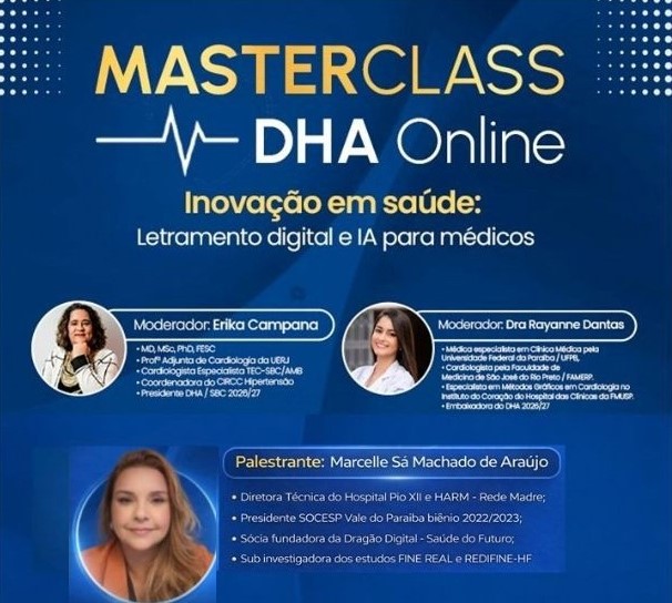 O webinar será mediado pela Dra. Erika Campana, médica cardiologista e presidente do DHA/SBC 2026/2027, e professora adjunta de cardiologia na Universidade do Estado do Rio de Janeiro (UERJ); e pela embaixadora do DHA/SBC 2026/2027, a Dra. Rayanne Dantas, médica especialista em clínica médica pela Universidade Federal da Paraíba (UFPB). A especialista convidada é a diretora técnica do Hospital Pio Xll e HARM, Marcelle Sá Machado de Araújo, ex-presidente da Sociedade de Cardiologia do Estado de São Paulo (SOCESP) do Vale do Paraíba no biênio 2022/2023, que apresentará uma abordagem prática sobre letramento digital aplicado à medicina, explorando como ferramentas de inteligência artificial, análise de dados e automação podem ser incorporadas com segurança e eficiência ao dia a dia clínico.
