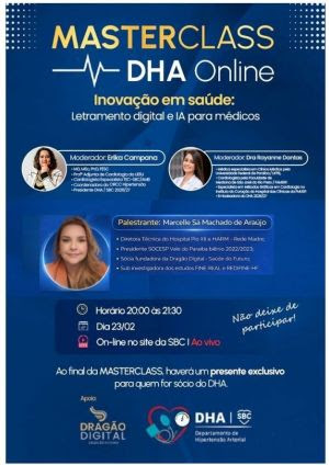 O Departamento de Hipertensão Arterial (DHA) da Sociedade Brasileira de Cardiologia (SBC) promove, no dia 23 de fevereiro, às 20h, a primeira edição do MASTERCLASS DHA Online, ao vivo no site oficial da SBC. Com o tema “Inovação em saúde: Letramento digital e IA para médicos”, o webinar é dedicado a todos os profissionais da área da saúde e reúne especialistas médicos em uma conversa prática e atual sobre como a tecnologia e a inteligência artificial (IA) já estão transformando a medicina, e como esses profissionais podem utilizá-las na prática clínica. Serão realizadas seis edições ao longo do ano, cada uma abordando um tema diferente do universo do cuidado, prevenção e tratamento de doenças.