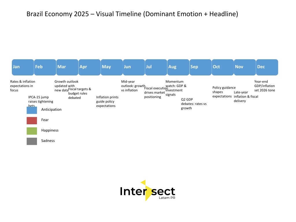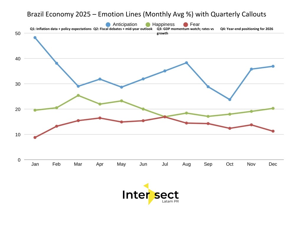 No Brasil, essa dinâmica ficou evidente em 2025. De acordo com a Análise de Clima Emocional (ECR), desenvolvida pela Delta Analytics para a Latam Intersect, a expectativa foi o sentimento predominante durante todo o período, sustentada principalmente por três eixos: pressões inflacionárias, condução da política monetária e percepção de risco fiscal. O ponto mais elevado ocorreu em janeiro (48,23%), quando as estimativas de mercado para a inflação e as primeiras orientações do Comitê de Política Monetária, o Copom, passaram a direcionar a narrativa econômica. Em fevereiro, a aceleração do IPCA, Índice Nacional de Preços ao Consumidor Amplo, reforçou a leitura de um cenário de condições monetárias mais restritivas. Ao longo do ano, discussões sobre o equilíbrio das contas públicas, a meta fiscal de 2025 e o ritmo da execução orçamentária, somadas no segundo semestre aos indicadores de atividade econômica e investimento, passaram a embasar as perspectivas para 2026, mantendo o noticiário focado na formulação de cenários futuros e oportunidades emergentes.