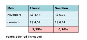 Em dezembro, o preço médio da gasolina nos postos de todo o Brasil registrou leve alta de 0,16% em comparação com novembro, chegando a R$ 6,34. O etanol também apresentou aumento no período, de 2,25%, sendo comercializado a preço médio de R$4,54. Os dados são da mais recente análise do Índice de Preços Edenred Ticket Log (IPTL), levantamento que consolida o comportamento de preços das transações realizadas nos postos de combustível em todo o País, garantindo uma média precisa.