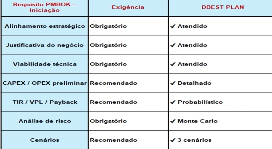 O artigo “Gerenciamento de Projetos da DBEST PLAN, supera as exigências requeridas, pelo PMBOK, na Fase de Iniciação, e, quando corretamente estruturada, pode e deve incorporar análises típicas de fases posteriores, reduzindo drasticamente o risco de projetos inviáveis avançarem para implantação. Ao integrar viabilidade técnica, econômica, financeira e probabilística já na Iniciação, a DBEST PLAN se alinha não apenas ao PMBOK, mas às melhores práticas internacionais de governança de projetos de capital intensivo.