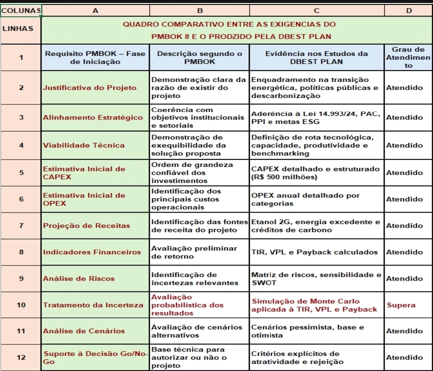 Além disso, são desenvolvidas análises de sensibilidade e de cenários (pessimista, base e otimista), identificando explicitamente as variáveis críticas — como produtividade, preço do etanol e CAPEX — e seus impactos sobre a atratividade do projeto. Essa prática está plenamente alinhada às recomendações mais recentes do PMBOK, que enfatizam a importância da gestão da incerteza e do risco desde as fases iniciais do ciclo de vida do projeto. Dessa forma, observa-se que os estudos da DBEST PLAN não apenas atendem aos requisitos da Fase de Iniciação definidos pelo PMBOK, como