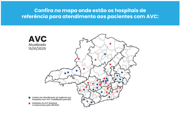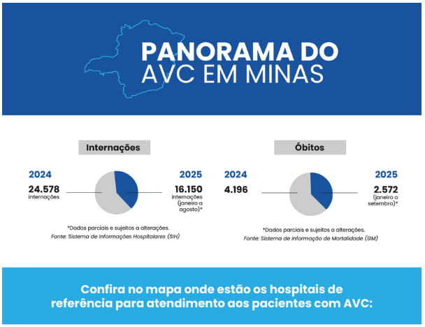 Em 2024, o AVC foi a sétima maior causa de morte em Minas, com 4.196 óbitos e média de 11 por dia. Com a ampliação dos centros, a mortalidade intra-hospitalar caiu de 16,5% em 2021 para 12% em 2024. O resultado decorre da maior capilaridade da rede, da tomografia em tempo oportuno, do uso do medicamento trombolítico e do treinamento das equipes de saúde.