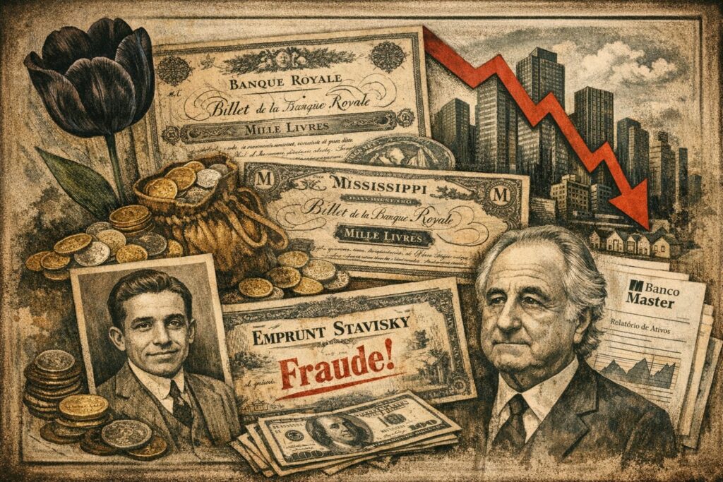 O Banco Master e seu controlador, Daniel Vorcaro, tornaram-se nos últimos anos um ponto de atrito raro no sistema financeiro brasileiro: não por um colapso consumado, mas por aquilo que parecem testar — os limites entre engenharia financeira legítima, tolerância regulatória e adiamento sistemático de perdas. O caso não se apresenta como um golpe clássico; não há promessa explícita de retornos impossíveis nem confissão de fraude. Há, sim, um arranjo complexo de ativos ilíquidos, rolagens sucessivas e confiança institucional. É justamente por isso que o episódio desperta um eco histórico. A história financeira está repleta de antepassados ilustres que, em contextos distintos, sustentaram a mesma ambição: transformar expectativa em lastro e tempo em solvência.