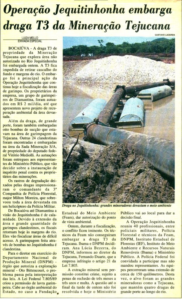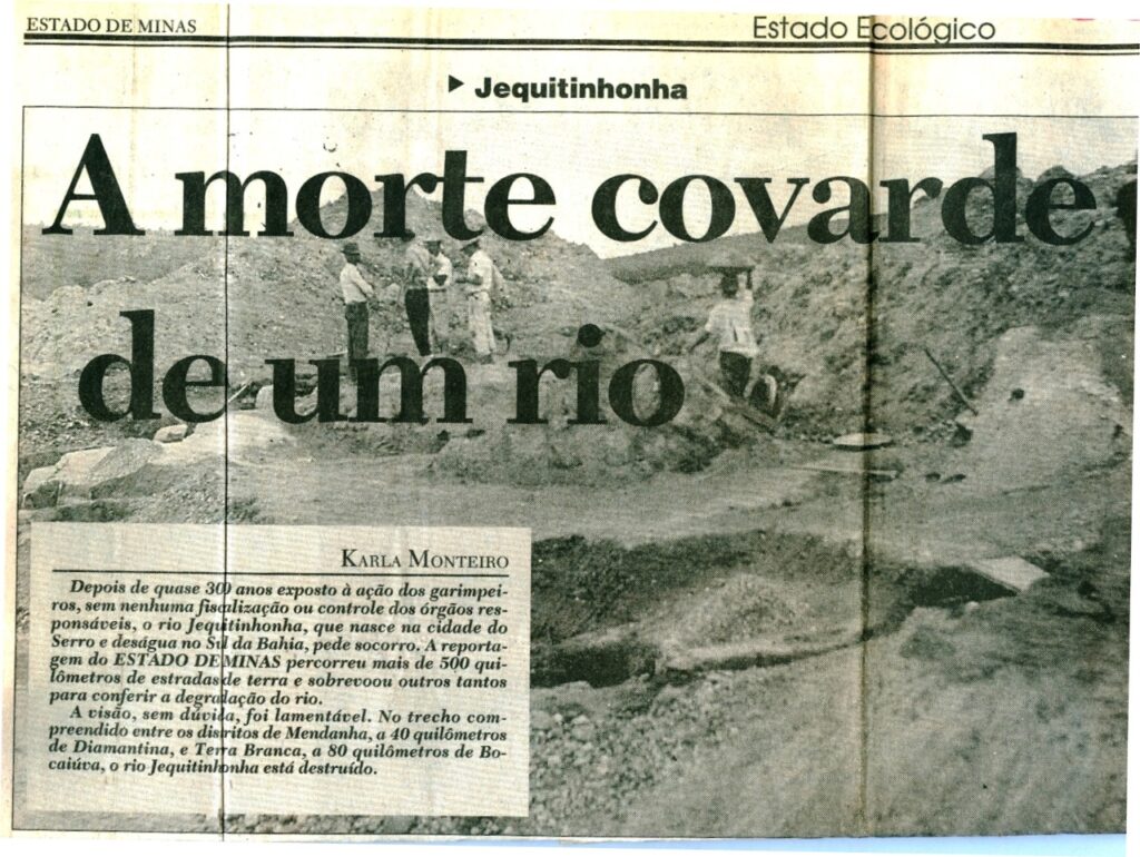 Em 1995 começamos uma verdadeira cruzada contra a mineração predatória no rio Jequitinhonha. As imensas dragas matavam o rio, e o mercúrio contaminava o povo das cidades ribeirinhas. Durante muitos anos, filhos do Vale denunciavam a triste situação, mas a imprensa não nos ouvia.