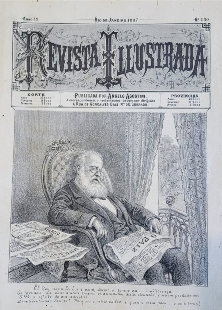 Até o fim de seu reinado, Dom Pedro II manteve essa prática de leitura e acompanhamento da imprensa, mesmo quando já se tornava claro que as bases do Império estavam ruindo. Ainda que, nos anos 1880, o monarca tenha sido representado no humor como um “velho frágil” e “indiferente” às questões políticas que lia nos jornais (observemos, por exemplo, as charges de Ângelo Agostini), é preciso relativizar essa “apatia”, compreendendo seu esforço como homem preocupado em entender as forças que o cercavam – inclusive aquelas que, paradoxalmente,