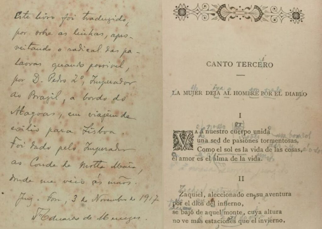 Ao receber o exemplar das mãos de Mota Maia, Eduardo de Menezes não apenas o guardou consigo como teve o cuidado de, em 3 de novembro de 1917, registrar e assinar na primeira folha a declaração de que as anotações a lápis, por entre as linhas do texto, são traduções feitas por D. Pedro II, do espanhol para o português.