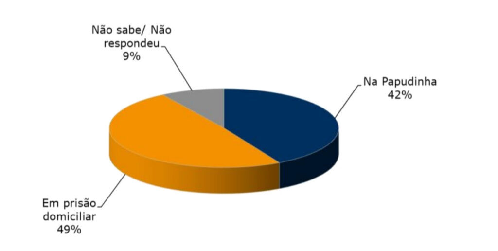 O levantamento também investigou a percepção dos brasileiros sobre o que deveria acontecer após o término do período de 90 dias de prisão domiciliar, caso a saúde do ex-presidente Jair Bolsonaro melhore. Para 49%, Jair Bolsonaro deveria seguir em prisão domiciliar, enquanto 42% consideram que ele deveria voltar a cumprir sua pena na Papudinha. Os que não souberam ou não responderam somam 9%.