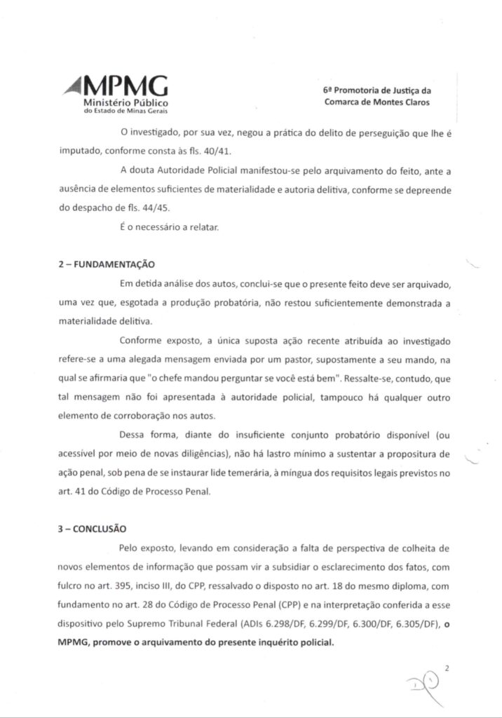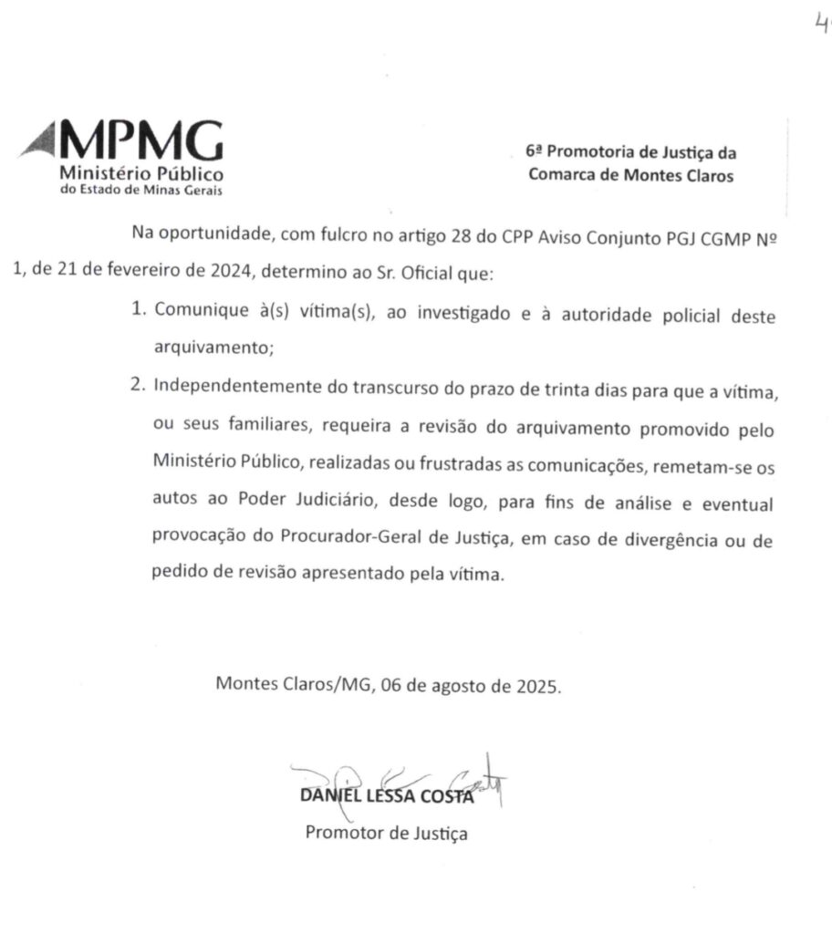 Segundo o despacho da 6ª Promotoria de Justiça da Comarca de Montes Claros, o inquérito foi arquivado por ausência de materialidade e autoria delitiva, após análise completa das provas e oitivas das testemunhas.