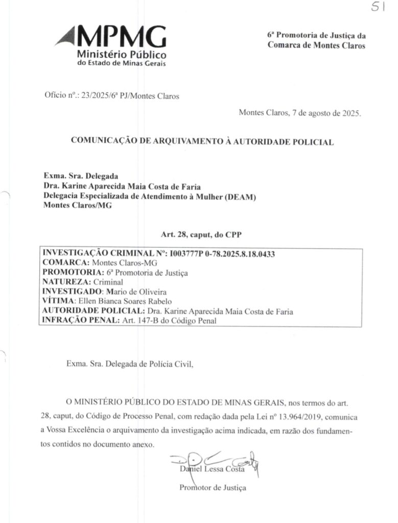 As informações apresentadas por Luciana de Melo sobre o arquivamento do processo foram confirmadas por documento oficial do Ministério Público do Estado de Minas Gerais (06/08/2025). O conteúdo foi divulgado sem identificação pessoal, respeitando o sigilo processual, conforme o art. 5º, inciso LX, da Constituição Federal.